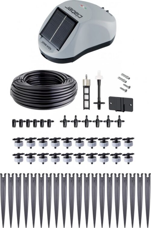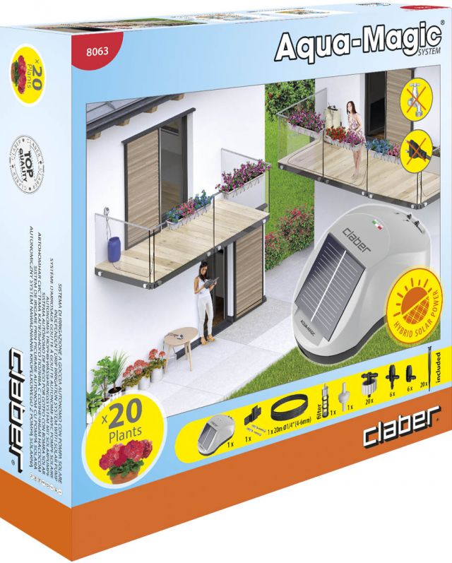 Automaatne süsteem taimede kastmiseks rõdul, terrassil, kasvuhoones. Sisaldab autonoomset päikesepatareidega laetavat taimeriga veepumpa, voolik, ührndused, tilgutid vähemalt 20 potitaimele. Aqua-Magic on uus eksklusiivne Claberi tilkkastmiskomplekt, mis võimaldab lihtsalt luua kastmissüsteemi terassil, kasvuhoones või väiksemas aias ja seda kõike ilma statsionaarse elektri- ning veeühenduseta. Komplektis olev päikesepaneel, tagab süsteemi tõrgeteta töö.