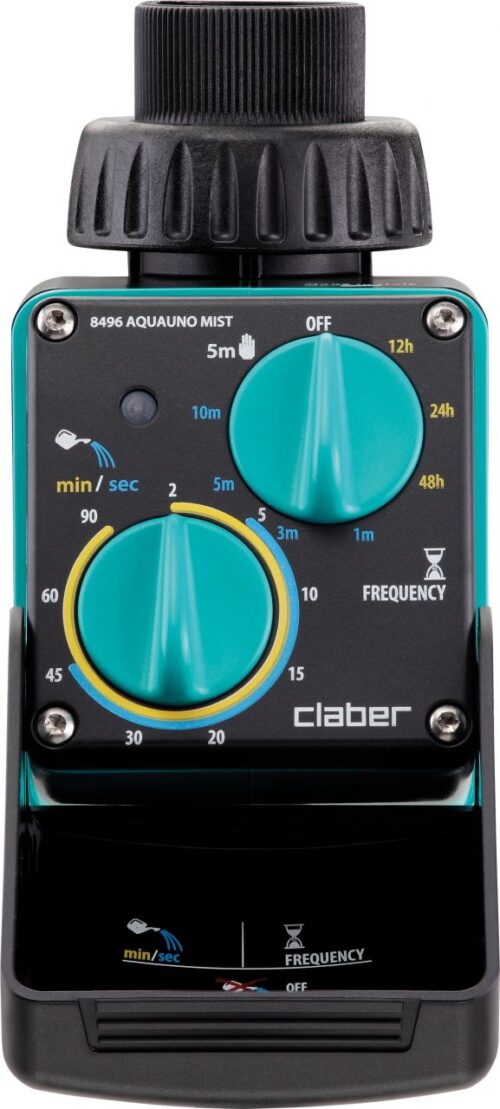 CLABER taimer "Happy Fresh" ühe väljundiga. Kaks ühes taimer sobib automatiseerimaks nii kastmissüsteeme, kui ka CLABER uut jahutussüteemi "Mist" terrassidel ja aedades. Taimer on lihtsasti käsitletav kahe eraldi nupuga kus ühega saame määrata kastmisaja ja teisega kastmiste vahelise intervalli. Kastmissüsteemide puhul saab valida 27 programmi vahel – kollane sektor, tööaeg 2-90 min iga 12, 24, 48 h tagant. Jahutussüsteemi puhul võimalus kombineerida 24 prorammi vahel – sinine sektor, tööaeg 5-45 sek iga 1, 3, 5, 10 min tagant. Taimer on varustatud pestava filtriga. Patarei toide (ei kuulu komplekti). Elektroniline osa on kindlalt suletud. Töörõhk 0,5-10 baari.