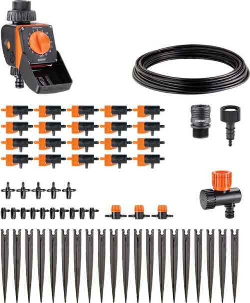 Eelhäälestatud programmidega patareiga töötav taimer, kraaniliitmik, ¼“ hargnemistoru, toruliitmikud, surve regulaator, reguleeritavad tilgutid: kõik vajalik selleks, et luua potitaimedele tööriistu kasutamata kastmissüsteem, varustades iga taime kindlalt veega.Valida saab 15 erineva programmi vahel, keerates lihtsalt taimeri lülitit. Ideaalne komplekt väiksemateks kastmisprojektideks või suurepärane kingiidee.