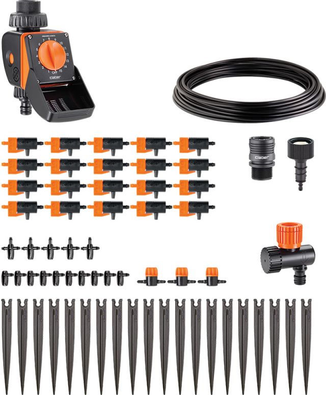 Claberi tilkkastmissüsteemi stardikomplekt programmkellaga sobib ideaalselt kuni 20 taime automaatseks kastmiseks nii kasvuhoones kui ka avamaal. Komplektis on olemas kõik vajalik, et muuta oma taimede kastmine lihtsamaks, mugavamaks ning automaatseks. Komplektis sisalduvav programmkella on sisse kodeeritud 15 erinevat kastmisprogrammi.