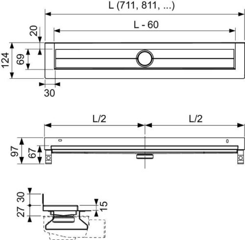 TECEdrainline sirge duširenn, seinaäärikuga ja Seal System hüdroisolatsioonilindiga* TECEdrainline sirge duširenn vertikaalse äärikuga paigalduseks seina vastu, koos Seal System hüdroisolatsioonilindiga. Sisaldab järgnevat: • Renni korpus koos poleeritud roostevabast terasest äärikuga, materjal 1.4301 (304) • Seal System hüdroisolatsioonilint paigalduseks kliendi poolt vedelasse või ribakomposiittihendisse • Ühendusklambrid betooni ankurdamiseks ja valikuliste montaažijalgade kinnitamiseks • Keskne ühendusdetail äravoolu tarbeks • Sisemine kallak vee äravoolu parandamiseks ja isepuhastumise tagamiseks • Tihend Pikkus viimistlemata olekus koos äärikuga = 711, 811, … mm Nähtav pikkus pärast paigaldust = 651, 751, … mm Laius viimistlemata olekus koos äärikuga = 124 mm Nähtav laius pärast paigaldust = 69 mm Paigalduskõrgus valmis põranda ülaservani (sõltuvalt sifoonist): • 67 mm sifoon “vertical” • 68,5 mm sifoon “e x tra-flat” • 95 mm sifoon “flat” • 120 mm sifoon “standard” Ettevaatust: Ei ühildu sifooniga “ma x “! Palun tellida eraldi: • Disainvõre või plaaditav renn • Sifoon • Montaažijalad (valikuline) • Heliisolatsioonimatt Drainbase (valikuline), et tagada paigaldise vastavus mürataset puudutavatele nõuetele kooskõlas standardites DIN 4109 ja VDI 4100 sätestatud müratasemetega (SSt) I kuni III