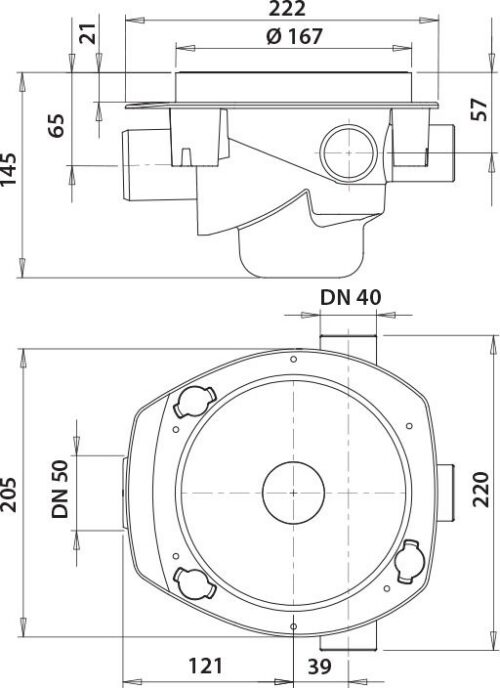Vieser One’i horisontaaltrapp DN50 on 50 mm kanalisatsiooniühenduse ja kolme 32/40 mm avatava külgliitmikuga põrandatrapp, mille saab paigaldada puit- ja betoonkonstruktsioonidesse.